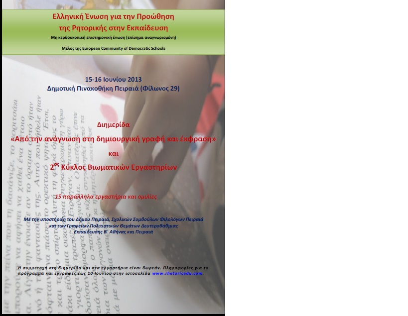 Η επιμορφωτική δράση της Ελληνικής Ένωσης για την Προώθηση της Ρητορικής στην Εκπαίδευση συνεχίζεται για έκτη χρονιά με τη διημερίδα «Από την ανάγνωση στη δημιουργική γραφή και έκφραση» και τον 2ο Κύκλο Βιωματικών Εργαστηρίων (Δημοτική Πινακοθήκη Πειραιά, 15-16 Ιουνίου 2013). Η συνάντηση διοργανώνεται με την υποστήριξη του Δήμου Πειραιά, Σχολικών Συμβούλων Φιλολόγων Πειραιά και των Γραφείων Πολιτιστικών Θεμάτων Δευτεροβάθμιας Εκπαίδευσης Β΄ Αθήνας και Πειραιά.