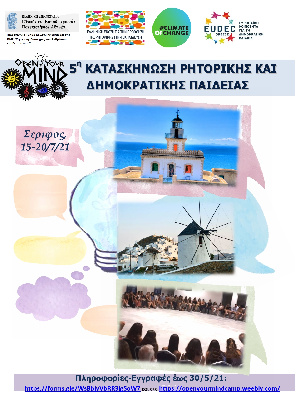 Για πέμπτη χρονιά η Ελληνική Ένωση για την Προώθηση της Ρητορικής στην Εκπαίδευση (www.rhetoricedu.com) προσκαλεί μαθητές Λυκείου και αποφοίτους 15-18 ετών από όλη την Ελλάδα στην κατασκήνωση Ρητορικής και Δημοκρατικής Παιδείας (https://openyourmindcamp.weebly.com/), μια καινοτόμο διοργάνωση που συνδυάζει διακοπές με προσωπική ανάπτυξη. Ο σχεδιασμός, όπως και τα προηγούμενα χρόνια, βασίζεται στο τρίπτυχο «Σκέψη – Λόγος – Δράση», καθώς και σε αρχές της δημοκρατικής παιδείας, όπως η ισότητα και ο αλληλοσεβασμός. Οι συμμετέχοντες/-ουσες μαθαίνουν να εκφράζονται ελεύθερα, να αγωνίζονται για θέματα που αφορούν σημαντικά, να σέβονται τις απόψεις των άλλων, να επινοούν στρατηγικές προκειμένου να επιλύσουν προβλήματα, να συνεργάζονται και να είναι δημιουργικοί. Ιδιαίτερη έμφαση θα δοθεί και φέτος στην ανάπτυξη δεσμών μεταξύ των μαθητών και στην ενθάρρυνση ανάληψης εθελοντικών πρωτοβουλιών κατά τη διάρκεια και μετά την κατασκήνωση.