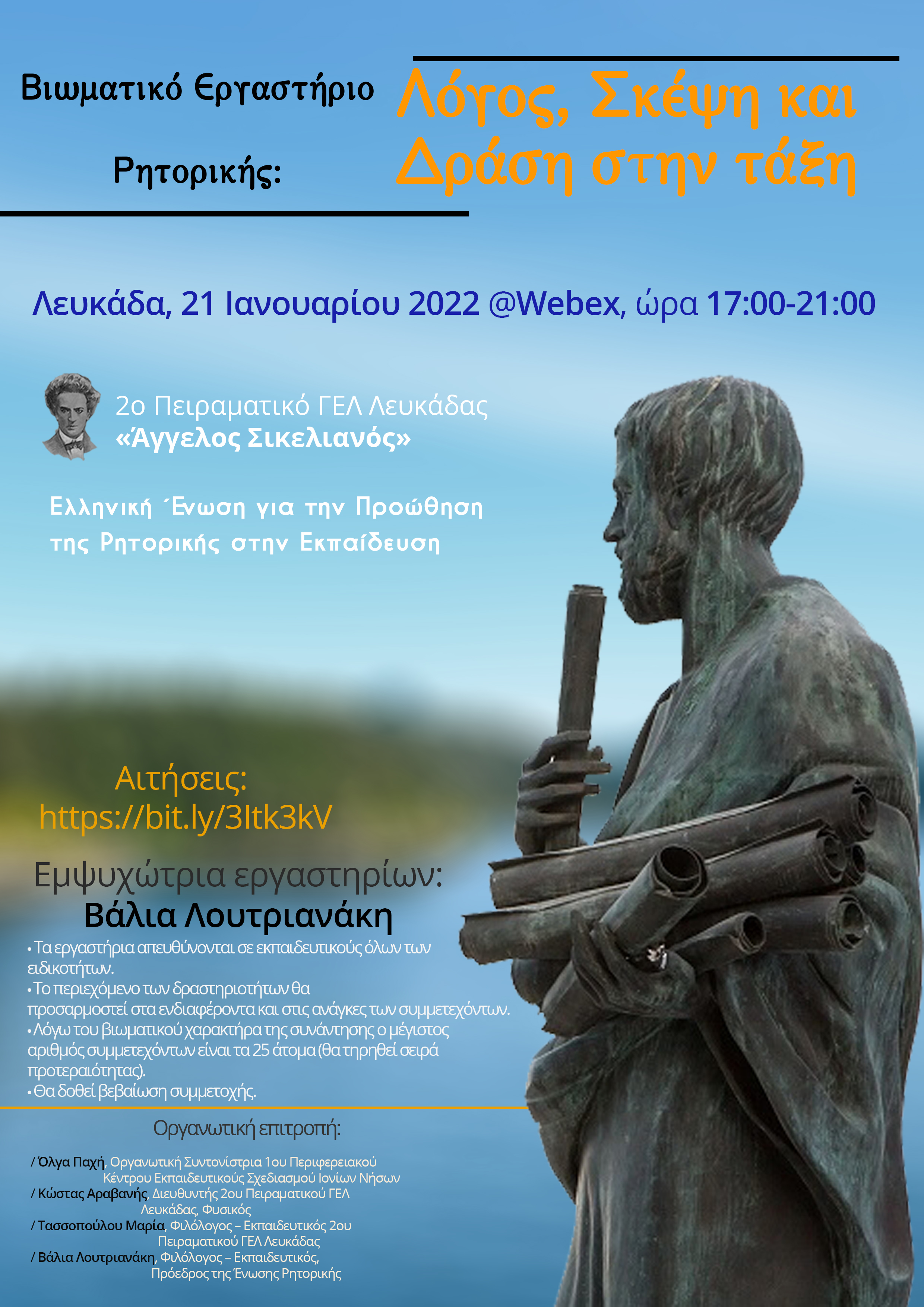 Συνδιοργάνωση: Όλγα Παχή, Οργανωτική συντονίστρια, 2ο Πειραματικό ΓΕΛ Λευκάδας «Άγγελος Σικελιανός», Ελληνική Ένωση για την Προώθηση της Ρητορικής στην Εκπαίδευση
